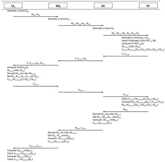 - MSj received with IDlsk, Nlsk from LSk generates the random number Nmsj and sends IDlsk, IDmsj, Nlsk, and Nmsj to HS.