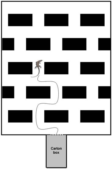 In order to compare the explorative behaviour of Zootoca vivipara with that of Podarcis muralis, we employed the same experimental apparatus previously used in Csermely et al. [32] (Figure 1), modified, consisting in a 54 × 66 cm PVC base maze with 10 cm high sides. Thirteen 12 × 10 × 6 cm blocks were scattered regularly on the base at the distance of 6 cm each other; four additional 6 × 10 × 6 cm blocks were located against two sides of the base; their length was limited to one-half of that of the others so as to maintain the regular reciprocal distance among the blocks. The blocks’ presence had to induce the exploring lizard to continuously change direction when it arrived at the T-crossroads, then forcing it to decide to go either to the left or to the right. The blocks were attached to the base with adhesive tape. They were made of a series of commercial Duplo® bricks (Lego A/S, Billund, Denmark) and covered with plastic adhesive paper with marble coloration to prevent the lizards from climbing them. Experiments were conducted without transparent cover, for possible interferences of the reflectance of neon light placed on the top of the maze. The apparatus was located in a circular tub (110 cm of diameter, 50 cm high), necessary to contain animals in case of escape and to avoid possible surrounding influences on the individual behaviour. In addition, four black corrugated honeycomb panels were collocated all around the apparatus, working as screens for the operator.