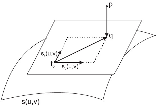 We firstly derive the expression of footpoint q. Assume that parameter takes the value so that the test point orthogonally projects onto the parametric surface . It is not difficult to show that there is a relational expression