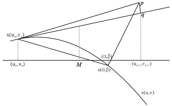 Our proof method is analogous to those methods in references [32,33]. We project all points, curves and the surface of Figure 1 onto the plane, and this yields Figure 2. When the iterative Formula (5) starts to iterate, according to the graphical demonstration, the corresponding parametric value of the footpoint q is . The middle point of point and point is M where . From the graphic demonstration, there are two inequality relationships and . These results indicate two inequality relationships and ; namely, there is an iterative relational error expression , where . To sum up, we can verify that convergence of the iterative Formula (5) is independent of the initial value. ☐