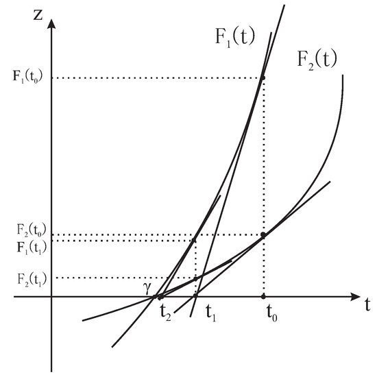 We give a geometric interpretation of Newton’s iterative method with two variables in Figure 5, where abscissa axis t represents the two-dimensional coordinate , the vertical coordinate z represents function value or . Curve and actually denote two surfaces in three-dimensional space, which are determined by the first and the second Formula in Equation (23), respectively. γ is the intersection point of two lines, the first of which is the intersection line of and plane t, and the second of which is the intersection line of and plane t. In another way, γ is the solution to Equation (23). Through point , draw a line perpendicular to the plane t, and then the perpendicular line intersects the surface and , respectively. The intersection points are designated as the first and the second intersection point, respectively. Through the first and the second intersection point, we make two tangent planes, respectively. These two tangent planes intersect with plane t and generate two intersection lines, which are designated as the first and the second intersection lines. Two intersection lines intersect to obtain the point . Given the intersection point , we repeat the procedure above to obtain the new first and the second intersection point, and then the new first and the second intersection lines. Finally, we can obtain the new intersection point . Repeat the above steps until the iterative value converges to =. Of course, it must satisfy the condition for the fixed point theorem of Newton’s iterative method before Newton’s iterative method starts to work.