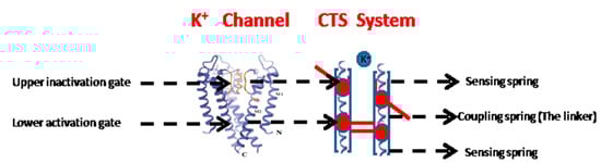 The structure of a potassium channel (left) and its spring-system analogue (right). The sensing springs are analogous to the upper and lower gates of the channel, and the coupling spring is analogous to the gate linker, which connects the two gates.