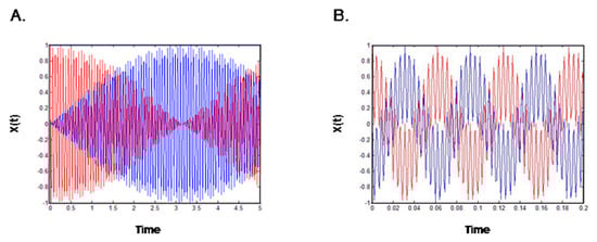 Figure 2A represents Equation (19) and indicates that energy was transferred from one gate to the other and that the amplitude of movement of one gate was increased, while that of the other was decreased. The gates are thus poorly coordinated and, in the real-world analog, the ions would not pass through the pore. The opposite scenario, in which the two gates are coordinated, is represented by the equation: