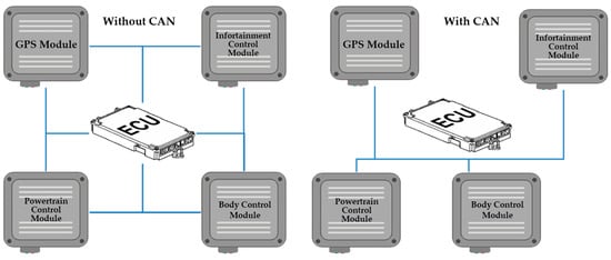 As briefly described in the previous section, CAN bus was developed by Bosch in the early 1980s due to the needs of many automotive makers []. The main objective of early CAN bus was to define a standard for network communication between sensors, actuators, controllers, and other nodes in real-time applications and to minimize redundant wiring [,]. Figure 2 below shows the general idea of CAN bus.