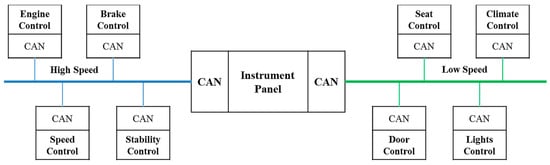 One of the well-known technologies regarding this in modern vehicles is embedded systems, also known as Electronic Control Units (ECUs), which consist of more than seventy microprocessors communicating over networks to control a vehicle infotainment system, powertrain, etc. []. However, microprocessors cannot directly communicate by themselves so a standard protocol has to be defined for transmitting and receiving data packets [,]. The protocol refers to the Open System Interconnection (OSI) seven layers’ model consisting of a physical layer, data link layer, network layer, etc., and the CAN protocol standardizes two lower layers, which are the physical and data link layer [,]. In addition, the targeted applications in automobiles using CAN bus communication are an anti-lock brake system, driving assistant system, engine control, etc. []. Note that there are various communication protocols used in the different categories of modern vehicles such as the Local Interconnect Network (LIN) for the body, FlexRay for X-by-wire applications, Bluetooth, etc. []. The reason for focusing on CAN bus in this paper is due to its speed and cost-effectiveness compared to other protocols.