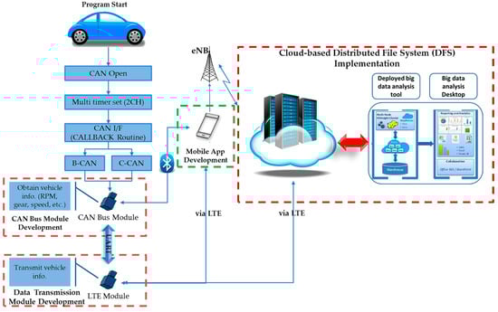 According to our proposed system architecture shown in Figure 5 above, there are three main components which need to be developed. The first component is the CAN bus module, through which the vehicle information mostly related to the powertrain can be obtained. However, this CAN bus module has hidden features which can remotely control a vehicle through a mobile application. Since these hidden features are out of the research scope, we will not mention them in the rest of the paper. Yet, once information is obtained by the CAN bus module, such information can be transmitted to a mobile device through Bluetooth and is checked by software on the PC. The second main component is to develop a data transmission module. This data transmission module is developed based on 4G-LTE. Data transmission heads to two targets such as a mobile device and server, but its primary destination is the server. The third main component is a mobile application targeted at two things: (1) to check vehicle malfunction codes by interacting with the server; (2) to transmit the obtained information to a cloud-based DFS via wireless communications. The last expected main component is to implement the cloud-based DFS.