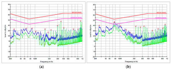 We also officially requested system testing and an evaluation to see whether our developed modules met the criteria of both broadband and narrowband radiated disturbances in South Korea. Testing was conducted in the thirteen specific frequency ranges (30~50, 50~75, 75~100, 100~130, 130~165, 165~200, 200~250, 250~320, 320~400, 400~520, 520~660, 660~820, and 820~1000 MHz) and we confirmed that our modules fulfilled the testing criteria of broadband and narrowband radiated disturbances. Table 1 describes the testing criteria and Figure 9 illustrates the testing results.