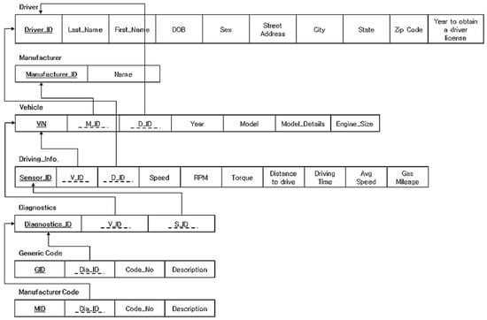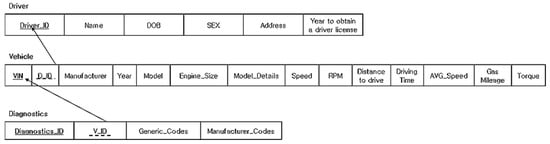 DB was implemented based on Microsoft Structure Query Language (MS-SQL), but as mentioned in the second research direction, our initial relational DB was designed by three DB tables such as the driver, vehicle, and diagnostics shown in Figure 10 below.