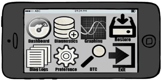 From this section, we mainly focus on proposing system design because we have not developed actual deliverables. The intended mobile application is composed of seven functionalities, i.e., dashboard, diagnostics, graphing, restore, diagnostics logs, preferences, and diagnostics search. To design the mobile application, we referred to a variety of Android applications on the Play Google app (Google, Moutain View, CA, USA) market so that the name of the seven functionalities may change. The purpose of the mobile application is to check vehicle diagnostic codes and driving information in real-time. The planned development platform is OpenXC because it supports open source hardware and software.