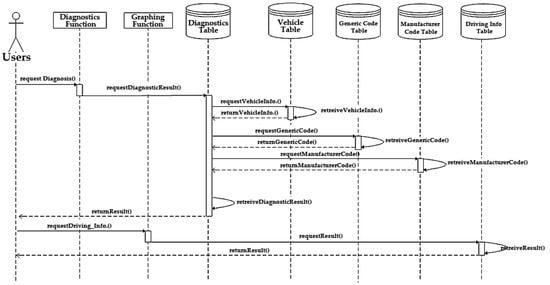 After our considerations were revealed, we realized one issue regarding the implemented SQL-based DB. Our initial plan was that the mobile application interacts with the server in accordance with the user’s requests to obtain information on diagnostics and driving. Figure 13 depicts the flow of the diagnostics and graphing functionality using the sequence diagram.