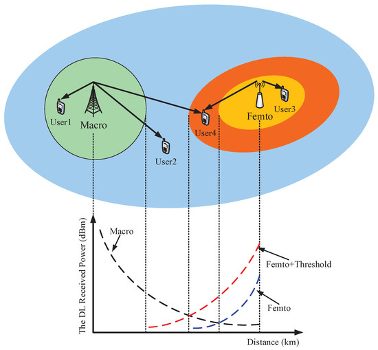 The deployment of multi-tier network architecture, namely heterogeneous networks (HetNets), is a promising approach to handle the exploding data traffic demands of users [1,2]. A typical HetNet consists of different types of base stations (BSs) such as macro, pico, and femto BSs (MBSs, PBSs and FBSs, respectively), which operate simultaneously to serve users, but differ in terms of their coverage range, spatial density, and most importantly, transmit power [3]. However, the large transmit power disparity of macrocells and small cells will lead to unbalanced user loads among different BSs [4]; that is, most users will prefer to associate with MBSs when the conventional maximum-received-power (MRP) user association scheme is applied. This results in an underutilization of resource utilization at small cells. To cope with this problem, the biased user association, also known as the cell range expansion (CRE) scheme, has been proposed [5], wherein the macro users are proactively offloaded to small cells. Unfortunately, the drawback of CRE is that the offloaded users are liable to experiencing excessive cross-tier interference, which is always the obstacle in HetNets. Naturally, the macro edge users (MEUs) also are vulnerable users. In this context, the concept of BS cooperation is expected to tackle such excessive interference [6,7]. One form of BS cooperation is coordinated multipoint (CoMP) transmission, wherein the users’ data is concurrently transmitted by multiple BSs in order to mitigate interference, and thereby improve the overall system performance [8,9].