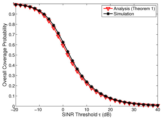 In Figure 2, the overall coverage probability for the LA-CTC scheme was validated by Monte Carlo simulations via MATLAB on a square window of 10 × 10 km. Each simulation result was averaged over iterations. For each realization, the locations of both the BSs and the users were generated by independent PPPs, while the FBSs within the inner region of each MBS were removed or deactivated. Then, the specific serving BS set was selected for each user on the basis of the LA-CTC scheme in Equation (1). The performance (i.e., coverage probability) of each user at each BS (which can be seen for a typical user at the origin) was evaluated. Finally, the mean value of the coverage probability was calculated. The details of the simulation procedure in [42] can be referred to as a pedagogical treatment to enable reproducibility. It can be seen that the analytical results match reasonably well with the simulation results. Hence, the performance trend of the LA-CTC scheme could be well captured by the analytical results. The small gaps were mainly due to the approximation of assuming that the density of the FBSs in the vicinity of the outer region was not changed.