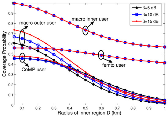 Before numerically analyzing the overall performance of the proposed scheme, we first analyze the conditional coverage probabilities of Equations (16)–(19) to obtain a better understanding of the overall performance trends. In Figure 3, it can be seen that the coverage probabilities of MIUs and femto users (i.e., and ) remained invariant with an increasing cooperation threshold, as and were independent of the cooperation threshold, whereas, as the radius of the inner region D increased, and decreased. This was because more macro users were allocated within the inner region; thus the interference from the macro tier increased. Meanwhile, the performance of femto users was degraded because more FBSs were deactivated. It can also be observed that the coverage probability of macro outer users (i.e., ) increased with an increasing cooperation threshold, as more users were offloaded to the femto tier. However, the coverage probability of the CoMP users (i.e., ) initially increased as the cooperation threshold increased, given an appropriate value of D, but it decreased beyond a certain prescribed distance value. This resulted from the fact that the non-uniform (cell-edge) deployment of FBSs can enhance the performance of CoMP users. When the prescribed distance exceeds a certain value, too many FBSs will be deactivated, which degrades the performance of CoMP users.
