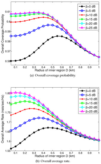 Figure 4 on the next page depicts the effect of increasing the radius of the inner region on the overall coverage probability and the average rate for different cooperation thresholds. It can be seen that the performance of the network can be improved by introducing the prescribed distance D (the radius of the inner region) for MBSs. The gains are obtained by the non-uniform deployment of FBSs. That is, the coverage area of FBSs increases and more users are offloaded to FBSs, as FBSs are deployed farther away from the MBSs. Hence, the more efficient deployment of FBSs enhances the performance of the network. For a given cooperation threshold, both the overall coverage probability and the average rate initially increase as the prescribed distance increases, but they decrease beyond a certain prescribed distance value. Hence, an optimal prescribed distance exists. The descending trend of the coverage probability and average rate is mainly due to more and more FBSs being deactivated, which degrades the network performance. This means that selecting an appropriate value of D indeed matters for the network performance.