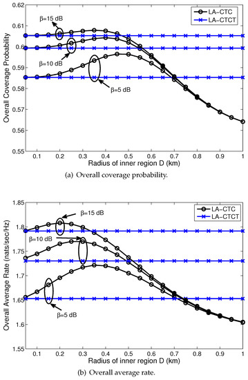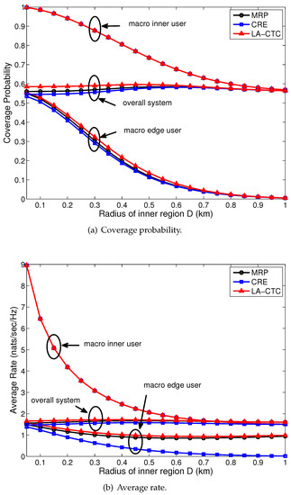 Figure 5 on the next page illustrates the coverage probability and average rate for the typical user with an increasing of the radius of the inner region D for the proposed LA-CTC scheme, for the MRP and for the CRE. From the perspective of MIUs, as the prescribed distance D increases, all schemes degrade the performance of the macro inner region while maintaining the same performance. This is caused by the fact that more users belong to the macro inner region; hence, the interference from the macro tier increases. In terms of the coverage and rate of the edge users and the overall system, the proposed LA-CTC scheme outperforms the MRP and the CRE. Compared to the MRP, the CRE degrades the performance of the macro edge region and the overall system. This is because the offloaded users usually do not experience the strongest received power, which deteriorates the SINR of the users. Note that all these results are obtained from the assumption that each BS has full buffer traffic downlink transmission for its connected user. On the other hand, compared to the CRE, the proposed LA-CTC scheme significantly improves the overall performance. This improvement is due to the offloaded users (i.e., CoMP users) being served by both the BSs, which improves the SINR of these users. The SINR degradation of offloaded users resulting from the CRE can be compensated for by CoMP transmission. Meanwhile, compared to the MRP, the overall performance gain from the proposed LA-CTC scheme results by means of jointly achieving load balancing for all the tiers and by interference mitigation for the offloaded users. The outperformance of the proposed LA-CTC scheme is guaranteed by the backhaul links between the BSs for exchanging the users’ data and the control information.