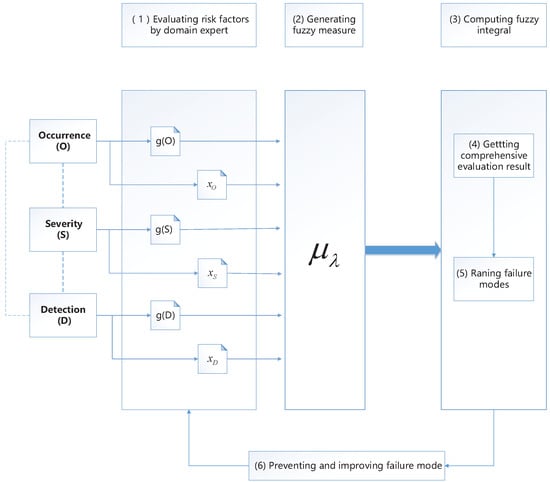 This paper proposes a method to improve RPN approach based on a fuzzy measure and fuzzy integral. Because fuzzy integrals do not need to assume the indicators are independent of each other, so a fuzzy integral is widely used in subjective evaluation problems where evaluation indexs are associated. In order to precisely and reasonably simulate the weights’ difference of the risk factors in FMEA, this paper uses a fuzzy measure to build a model for the weights of the occurrence, severity, and detection. The weights of risk factors given by domain experts are seen as fuzzy densities to generate a -fuzzy measure which can take the relevance and weights’ difference of risk factors into consideration. Then, the Choquet integral is used to fuse the evaluation results of the three factors and we can get the final comprehensive evaluation value of the failure mode. The main process is shown in Figure 1.