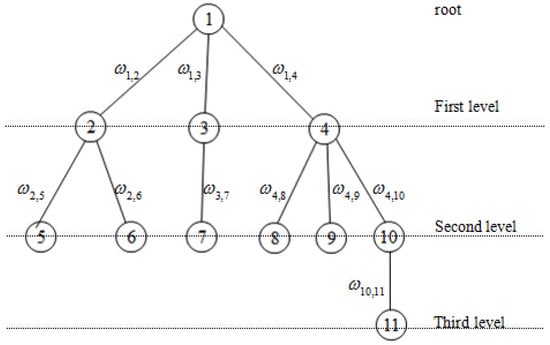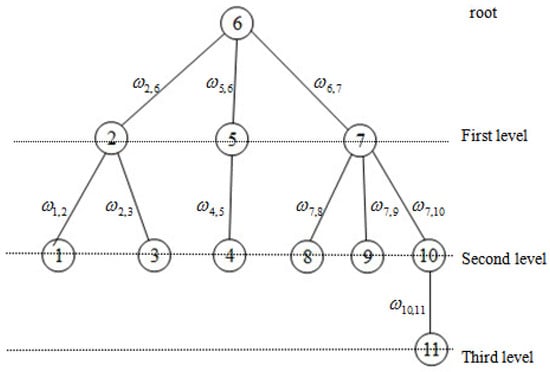 where is defined as the set of nodes connected to node i, excluding node j; sign if belongs to the same level and sign ; otherwise, , and .
