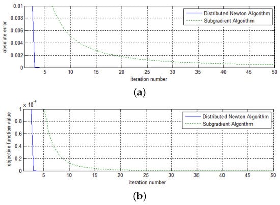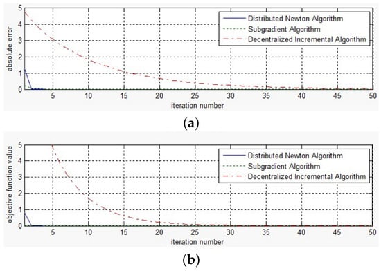 Absolute error along iterations for network with 100 nodes (1). (a) Absolute error; (b) Objective function value.
