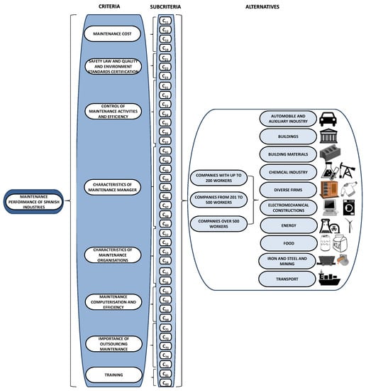 The first step for structuring the multicriteria model was to choose the decision criteria and subcriteria for assessing the state of maintenance in Spain. To this end, the starting point was 64 questions from the survey carried out by the SMA [79]. These 64 questions have been modified and turned into a form that may be considered decision criteria. These criteria are exhaustive, concise, non-redundant and independent [80].
