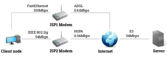 There are two experimental setups. In the first scenario (Figure 2), a multi-homed device is connected to a remote server with two ADSL connections (through an IEEE 802.11 g interface and a FastEthernet interface). In the second scenario (Figure 3, a multi-homed device is connected to a remote server with one HSPA+ network interface and one ADSL through FastEthernet interface.