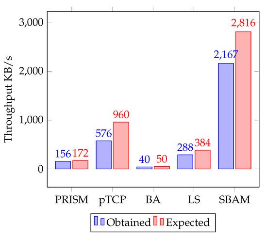 Comparing our results to those achieved by PRISM [15,16] (high tier), BATCP has a higher exploitation rate. This means that the bandwidth aggregated by BATCP has higher throughput. Another solution that shows acceptable performance is called BA with SCTP [36], with an exploitation rate. However, this approach limits users to the use of the Stream Control Transmission Protocol (SCTP), which is not used by most of today’s applications. The protocol called Load-Sharing SCTP (LS-SCTP) [38,39] has lower exploitation rate than Bandwidth-Aggregation with SCTP, and also restricts users to the use of SCTP.