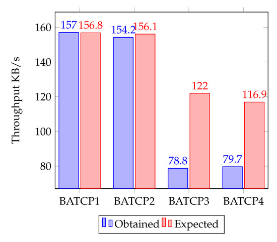In Figure 8, MPTCP1 and MPTCP2 are the results obtained in [27] using a jellyfish topology and permutation traffic (MPTCP1) and discontinuous traffic (MPTCP2). Results show that MPTCP performs optimally when using a constant traffic pattern, achieving of network usage aggregating six MPTCP flows. On the other hand, MPTCP2 achieves of network usage when discontinuous traffic was transferred. This result is comparable to BATCP3 and BATCP4, where the traffic using the HSPA network interface also behaves in burst mode, achieving and network utilization, respectively.