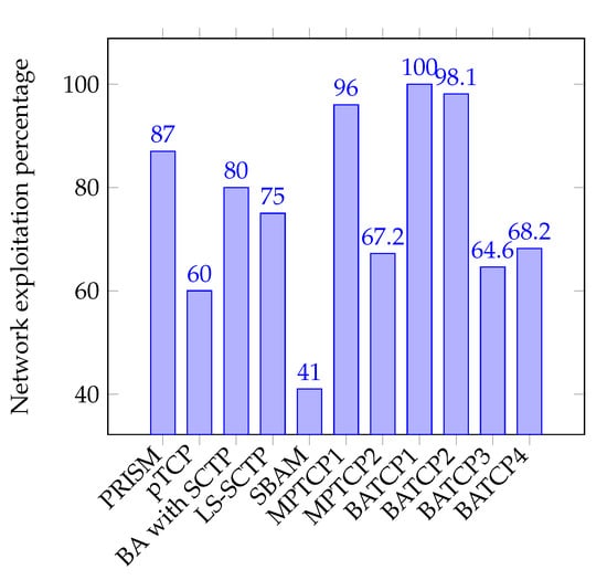 The low tier of proposed solutions comprises pTCP [28,29,30] and SBAM [44] solutions, with an exploitation rate of and , respectively. In BATCP, when one stable network is used in combination with a network with high jitter and delay, it achieves an exploitation rate ranging from to , outperforming prior solutions even when is performing poorly.