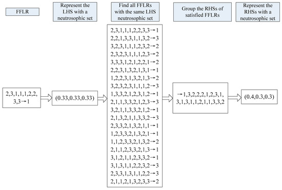 Step 3: In order to convert the FFLRs to NLRs, first of all the LHSs of the FFLRs in Table A2 are represented by a neutrosophic set, respectively (shown in Table A2). Then, the RHSs of the FFLRs are grouped with the same LHS neutrosophic set value into the RHSs group. A neutrosophic set is used to represent the RHSs group. For example, the LHS of FFLR 2,3,1,1,1,2,2,3,3→1 can be represented by the neutrosophic set (0.33,0.33,0.33). The detailed grouping and converting processes are shown in Figure 2.