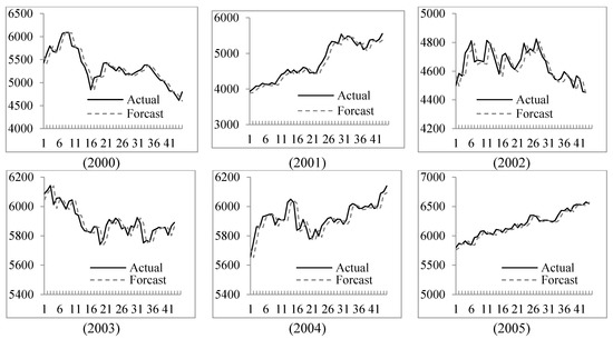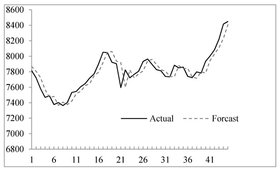 where n denotes the number of values forecasted, forecast(t) and actual(t) denote the predicted value and actual value at time t, respectively. S is a test statistic of the Diebold method that is used to compare the predictive accuracy of two forecasts obtained by different methods. Forecast1 represents the dataset obtained by method 1, and Forecast2 represents another dataset from method 2. If S > 0 and at the 0.05 significance level, then Forecast2 has better predictive accuracy than Forecast1. With respect to the proposed method for the ninth order, the MSE, RMSE, MAE, and MPE are 9753.63, 98.76, 76.32, and 0.01, respectively.
