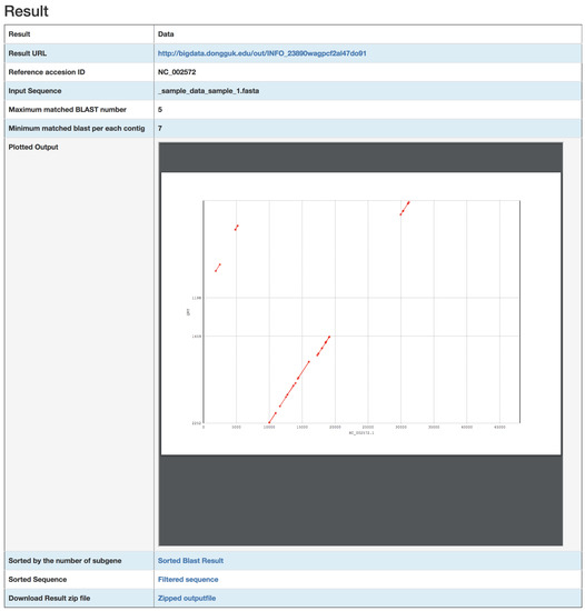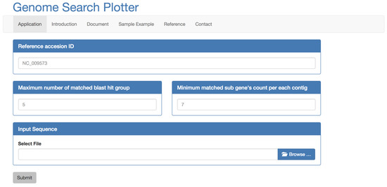 The proposed program was designed with a web-based interface for convenient use by biologists (The accessible URL is http://bigdata.dongguk.edu/genome_search_plotter). It uploads contigs obtained by assembly and provides the results (Figure 2). The mandatory inputs include the following three user-defined values: The first user-defined value is the reference accession ID, which is used to extract the whole amino acid and nucleotide sequence of CDS regions from the NCBI GenBank database. A method of sampling the amino acid sequence extracts features named as CDS regions in the NCBI GenBank database, corresponding to a DNA section where protein expression occurs. CDS refers to a sequence after the transcription and splicing, where all intron regions are removed and only the exon remains.