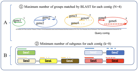 refers to the group’s ID and refers to a sub-gene that belongs to the i-th group. Regardless of backward or forward matching between the start and end positions, all sub-genes that belong to the i-th group must be located between the start and end positions in the i-th group. N refers to the maximum number of BLAST hit groups that should be searched and set by a user; it is the maximum number of i.