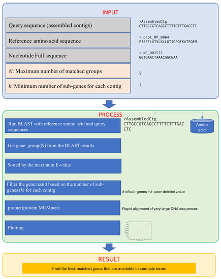 Whenever an analysis request is inputted, a new individual ID is assigned and a job space is provided to perform the task. First, BLAST is performed with the reference model, in which the inputted assembled query contigs are compared with the amino acid reference sequences. Grouping is done based on a comparison of the start and end positions matched with a comparison of the inputted user-defined values after performing BLAST, thereby selecting only as many groups as inputted value for the maximum number of groups. The selected groups are then ordered based on the E-value of BLAST in ascending order. After BLAST and the grouping comparison, an alignment is done based on the number of matched sub-genes in each of the queries in descending order. Here, filtering and naming of the query sequence are conducted only when the number of sub-genes is larger than the inputted value for the minimum number of sub-genes k, and gene information is provided. The whole process for obtaining the results is explained in Figure 4.