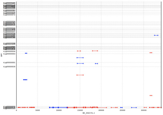 Example plot of contigs that are optimally matched: The Y-axis shows the query sequences and the X-axis shows the reference sequence. The red-colored lines show forward matching with the reference sequence, and the blue-colored lines show backward matching with the reference sequence.