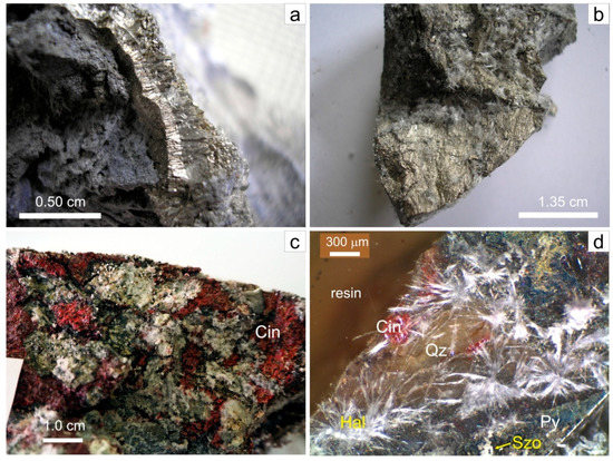 Mineral sample aggregates: (a) a fresh silicified rock fragment with coarse radial colloform pyrite from the Velin Dol (VD) mine section, level 550; (b) massive colloform pyrite aggregate with oxidation products formed in laboratory conditions; (c,d) slightly oxidized cinnabar-colloform pyrite (+carbonate, fluorite, and quartz) aggregate: fragment (c) and polished section (d). Samples (b–d) are from the Lukina Padina (LP) mine section, level 495. Image (d) is from a binocular microscope. Abbreviations: Py, pyrite; Cin, cinnabar; Qz, quartz; Szo, szomolnokite; Hal, halotrichite.