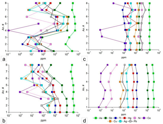 Distribution patterns of some trace elements in colloform pyrite growth zones along:(a) and (b) transverse section of sample LP630/3a, areas A and B, respectively; (c,d) randomly orientated sections of colloform pyrite-bearing aggregates in samples ch603 and VD1 (area A), respectively. Samples LP630/3a and ch603 are from the Lukina Padina mine section, whereas VD1 is from the Velin Dol mine section. An. #, analysis number is as in Table 1 and Table 2 and Figure 4a,b.