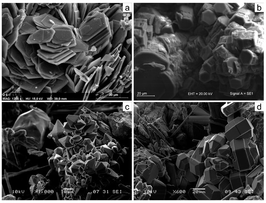 SEM-SEI of coquimbite aggregates: (a) hexagonal plates (prism end pinacoid forms); (b) hexagonal prisms; (c) hexagonal dipyramids; (d) complex shape including all previous mentioned forms.
