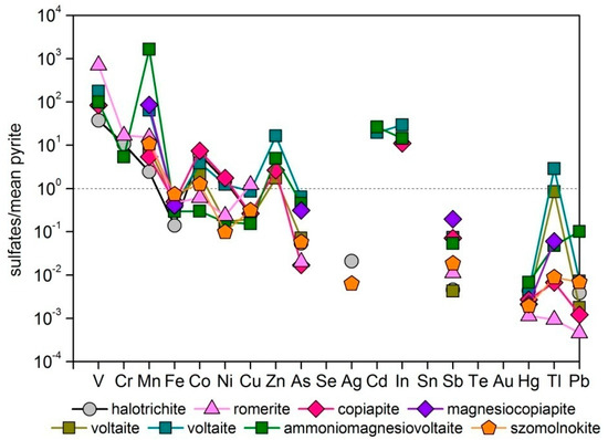 Therefore, it can be assumed that As, Sb, and Tl are entirely inherited in the efflorescent sulfates. The same can be suggested for Co, Ni, Cu, Zn, and Cd. They occur as concentrations commensurable to those detected in pyrite.