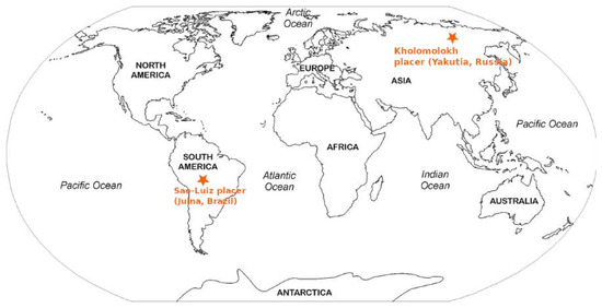 Previous studies indicate that most diamonds have been formed at depths of 120–200 km at pressures of 4–6.5 GPa and temperatures of 950–1300 °C [1,2,3,4,5,6]. However, a small number of diamonds (less than 1% of diamonds worldwide [7]) apparently crystallized at higher depths in the transition zone of the upper mantle (>410 km) or even in the lower mantle (>660 km). These so-called super-deep diamonds seem to form in the sublithospheric mantle either in primary mantle rocks or in subducted mafic rocks of the oceanic lithosphere [8,9]. Mineral inclusions in super-deep diamonds could be divided into three paragenetic groups: (1) metaperidotitic (comparable with the peridotitic upper mantle paragenesis), according to experimental data and study of inclusions in natural super-deep diamonds [10,11,12] containing ferropericlase (Mg,Fe)O + bridgmanite (Mg,Fe)SiO3 + jeffbenite (former tetragonal almandine–pyrope phase, TAPP) (Mg,Fe)3Al2Si3O12 + Ca-perovskite CaSiO3 + olivine (Mg,Fe)2SiO4; (2) metabasic (equivalent to the eclogitic upper mantle paragenesis) with majoritic garnet, Ca-perovskite Ca(Si,Ti)O3, stishovite SiO2 + Al2SiO5, Ca–Al-silicate (CAS), NAL (new aluminum phase) and CF (calcium–ferrite structured phase); and (3) carbonatitic (equivalent to Ca-rich mantle material) comprising Ca-silicates (e.g., merwinite), Ca–Mg–Fe carbonates, and Na–K–Ca carbonates. Hutchison et al. [13] suggested that metabasic diamonds dominate in the transition zone, but the lower mantle mostly carries diamonds with metaperidotitic inclusions. Super-deep diamonds were reported in various worldwide localities [13,14,15], i.e., alluvial placers of the Saõ-Luiz river in Brazil [16,17] and northeastern Siberian Platform [18,19].