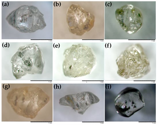 Microphotographs of super-deep diamonds. (a) SL-34; (b) SL-52; (c) SL-55; (d) SL-16; (e) SL-2; (f) SL-24; (g) SL-82; (h) SL-74; (i) HH-11. (a–h) super-deep diamonds from São-Luiz alluvial placers (Juina, Brazil); (i) super-deep diamond crystal from Kholomolokh placer (Yakutia, Russia).