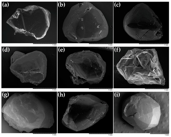 Morphology of studied super-deep diamonds (backscattered electron image). (a) SL-34; (b) SL-52; (c) SL-55; (d) SL-16; (e) SL-2; (f) SL-24; (g) C-2; (h) SL-82; (i) HH-11. (a–h) super-deep diamonds from São-Luiz alluvial placers (Juina, Brazil); (i) super-deep diamond crystal from Kholomolokh placer (Yakutia, Russia).