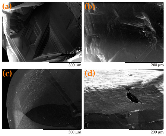 The crystals showed typical resorption features and retained only relics of primary growth morphologies [33,34,35,36,37]. The primary octahedral morphology manifested in many studied samples (e.g., SL-34, SL-55, SL-16; Figure 3a,c,d). These crystals have convex rounded surfaces observed near the crystal edges, which suggest their partial resorption. The shape of these crystals represents the transition from octahedron and rounded rhombic dodecahedron (so-called dodecahedroid). The relics of octahedral faces often show deep trigonal etch-pits (Figure 4a,b). The trigonal etch-pits are oriented in the opposite direction from the underlying face (negative trigons [38]). The number and size of the negative trigons, which differ even in individual crystals, may be caused by dislocations of different types and with impurity agglomerations, microcracks, and other surface defects [39,40].