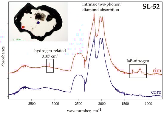 Nitrogen characteristics of super-deep diamonds from the São-Luiz alluvial deposit were previously described in [55,56,57]. FTIR spectroscopy has revealed local variations in nitrogen defects in diamonds from São-Luiz and Kholomolokh alluvial placers (Table 1). Diamonds from São-Luiz contain less than 51 ppm of nitrogen; in fact, many of them have zones with no detectable (<5 ppm) nitrogen and thus can be classified as type IIa. Previous studies have revealed the high proportion of nitrogen-free type II diamonds among super-deep diamonds [8,10,11,12,13]. The studied diamonds with detectable nitrogen were characterized by an extremely high nitrogen aggregation state (100% of B centers in most cases, type IaB diamonds) due to high temperatures of the transition zone and lower mantle. The presence of a band centered at 3107 cm−1 and attributed to hydrogen-containing defects [58] was detected only in diamonds containing nitrogen. Figure 5 depicts the representative FTIR spectra of super-deep diamonds (SL-52). The core of this diamond contains less than 7 ppm of nitrogen, whereas the rim has 50 ppm of totally aggregated nitrogen (pure IaB-type) accompanied with a higher-intensity 3107 cm−1 band. Diamond HH-11 from Kholomolokh alluvial placers had an internal zone containing no nitrogen (type II), whereas the nitrogen concentration in the outer zone reaches 115 ppm with an aggregation state of ~60%B [19].