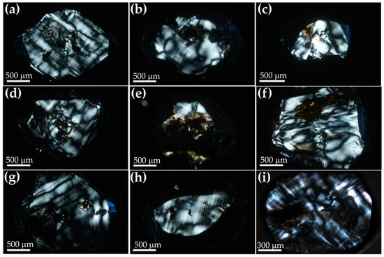 Birefringence in diamonds is an anomalous optical property. The interference pattern of anomalous birefringence is not expected in minerals of cubic syngony and may indicate a high degree of deformation of their crystal structure. Its appearance in diamonds is the result of lattice strains, modifying its natural isotropic properties [59,60]. Polarized microscopy observation of polished plates of super-deep diamonds shows anomalous birefringence patterns that may be related to deformation features of studied diamonds (Figure 6). The birefringence patterns of some studied diamonds have a specific “tatami” configuration, which is attributed to plastic deformation [60,61,62]. The birefringent lamellae are crystallographically defined and commonly occur parallel to an octahedral plane. In some samples, there can be more than one set of intersecting lamellae (e.g., samples SL-34, SL-82; Figure 6a,h), running parallel to different sets of octahedral planes.