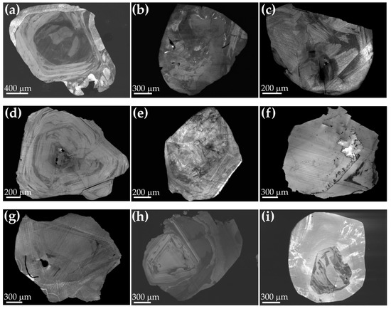 Cathodoluminescence (CL) images of diamonds help to visualize zonation and growth sectors, apparently due to different distributions of impurities of nitrogen and other structural defects [62,63]. CL images of the polished plates of the diamonds studied here visualize their complex growth histories (Figure 7). The crystals typically show several contrasting growth zones that may have thin-layered concentric zoning. The profiles of growth zones often have an irregular shape indicating that the morphology was distorted from the initiation of crystal growth. Many samples exhibit elements of octahedral zonation. Various zones of the crystals have traces of plastic deformations as a series of thin lines (deformation lamellae) intersecting different growth zones of the crystals. These features of the internal structure have also been detected in many previously described super-deep diamonds derived from different depth regimes [10,12,15,20,56,64,65,66].