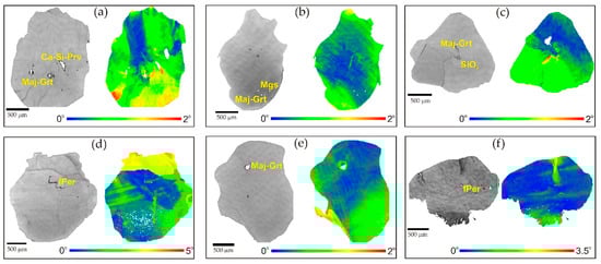 Misorientation patterns of super-deep diamonds from São-Luiz alluvial placers (Juina, Brazil). Electron backscatter diffraction (EBSD) maps over large parts of the polished plates showing a change in orientation. (a) SL-34; (b) SL-55; (c) SL-16; (d) SL-24; (e) C-2; (f) SL-82 (left—reflected light, right—EBSD image, bottom—misorientation degrees).