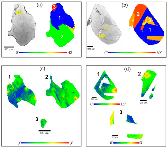Misorientation patterns of super-deep diamonds with large misorientations of subindividuals from São-Luiz alluvial placers (Juina, Brazil). EBSD maps over large parts of the polished plates showing a change in orientation. (left—reflected light, right—EBSD image, bottom—misorientation degrees). (a,c) SL-2; (b,d) SL-55. (a,b) EBSD maps over large parts of the polished plates showing a change in orientation. (c,d) EBSD maps of single subindividuals of samples.