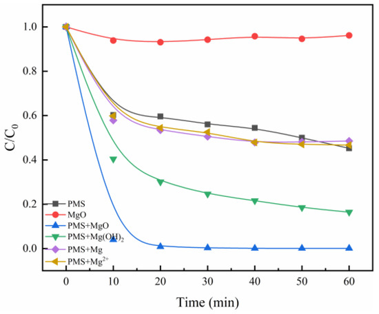 The degradation of MB by different Mg catalysts. Control conditions: (MB) = 10 mg/L, (PMS) = 0.8 g/L, (MgO) = 0.4 g/L, (Mg(OH)2) = 0.58 g/L, (Mg) = 0.24 g/L, (MgCl2) = 0.95 g/L, T = 25 °C.