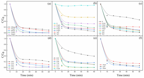 Effects of (a) MB concentration, (b) PMS dosage, (c) MgO dosage, (d) reaction temperature, (e) pH values, and (f) particle sizes of MgO on MB degradation. Control conditions: (MB) = 100 mg/L, (PMS) = 0.8 g/L, (MgO) = 0.4 g/L, pH = 7, T = 25 °C.