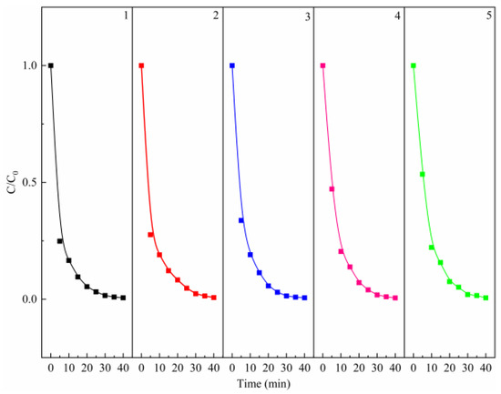 The effect of reaction temperature on the degradation of MB was investigated, and the results are shown in Figure 2d. As we all known, the rate of reaction depends on the probability of effective collision between molecules. The increase in temperature will greatly increase the collision between molecules, so the effective collision will increase, and the reaction rate will be faster [27]. As it can be seen from Figure 2d, temperature has a large effect on the decolorization efficiency of MB, and an increase in temperature (30, 35, and 40 °C) accelerates discoloration. Temperature, which increases the reaction rate between PMS and MgO and the generation rate of active oxygen species, exerts a strong effect on the degradation of MB.