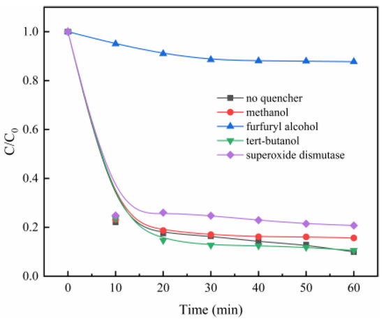 The good degradation effect of MB is ascribed to the catalysis of PMS by MgO, to generate the reactive oxygen species. In order to determine the contribution of different reactive oxygen species, different radical scavengers were added to the PMS/MgO system, including methanol for sulfate radical (SO4·−) [30], tert-butanol (TBA) for hydroxyl radical (·OH) [31], superoxide dismutase for superoxide anion radical (O2·−) [32], and furfuryl alcohol for singlet oxygen (1O2) [33]. As shown in Figure 4, the addition of tert-butanol (TBA) did not inhibit MB degradation, even though a large amount of tert-butanol (TBA) (TBA/PMS = 300, shown in Figure S4a) was added, suggesting that the hydroxyl radical may not be reactive oxygen species. A similar result is obtained when methanol, a scavenger of both hydroxyl radical and sulfate radical, is added to the PMS/MgO system, shown in Figure 4 and Figure S4b. This indicates that neither hydroxyl radical nor sulfate radical is the reactive oxygen species involved in the PMS/MgO system, which is different from the ordinary PMS catalytic process. Generally, sulfate and hydroxyl radicals are considered to be reactive oxygen species produced during the catalysis of PMS.
